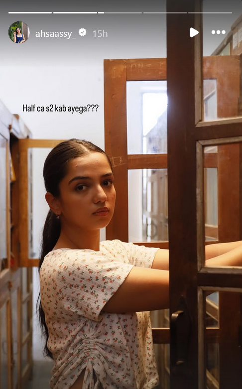 Late Monday night, the actor shared a picture of herself that has sparked speculation about Season 2 of Half CA. In the photo, Ahsaas is seen inside what looks like an old-school library or study area, dressed casually in a floral drawstring top and jeans. Her expression is quiet and thoughtful—but it’s the caption that caught everyone’s attention: