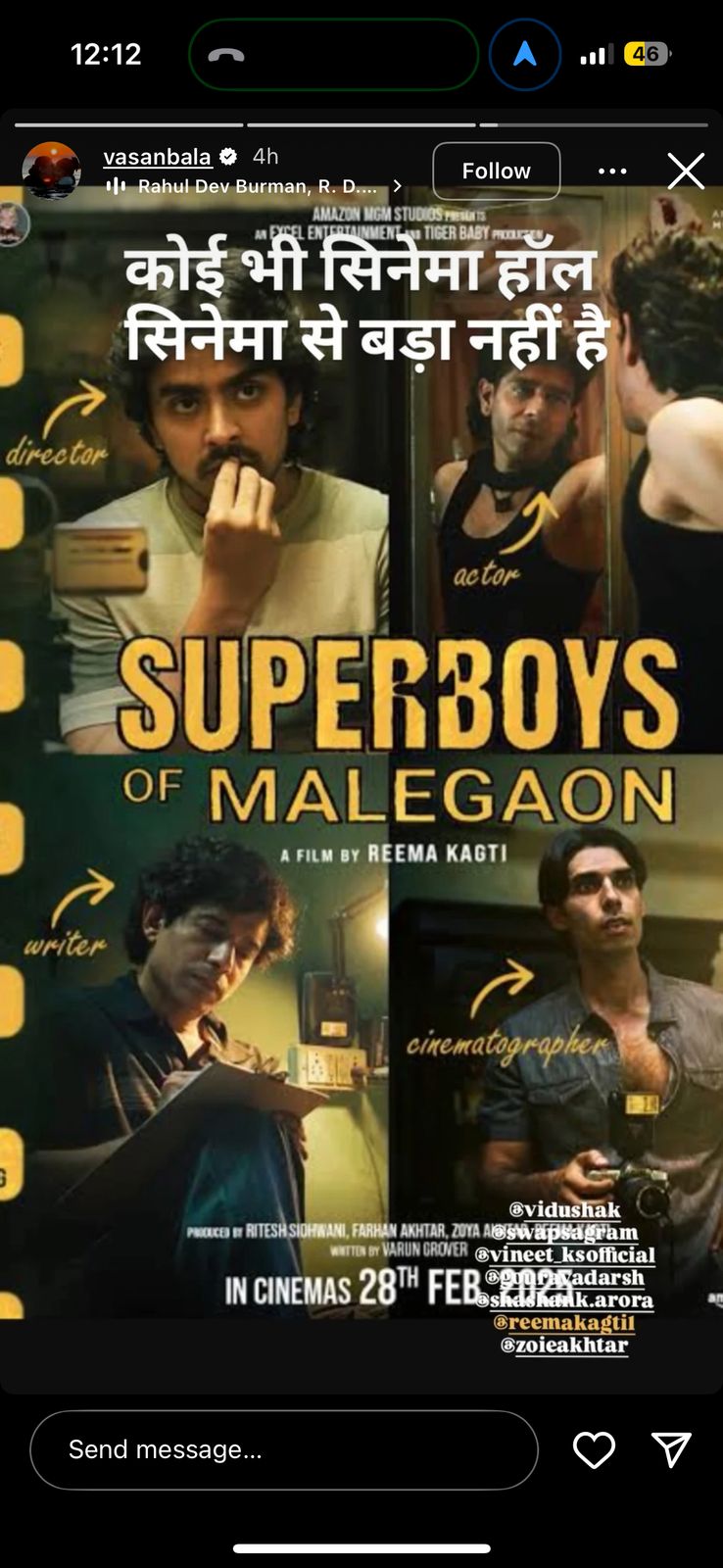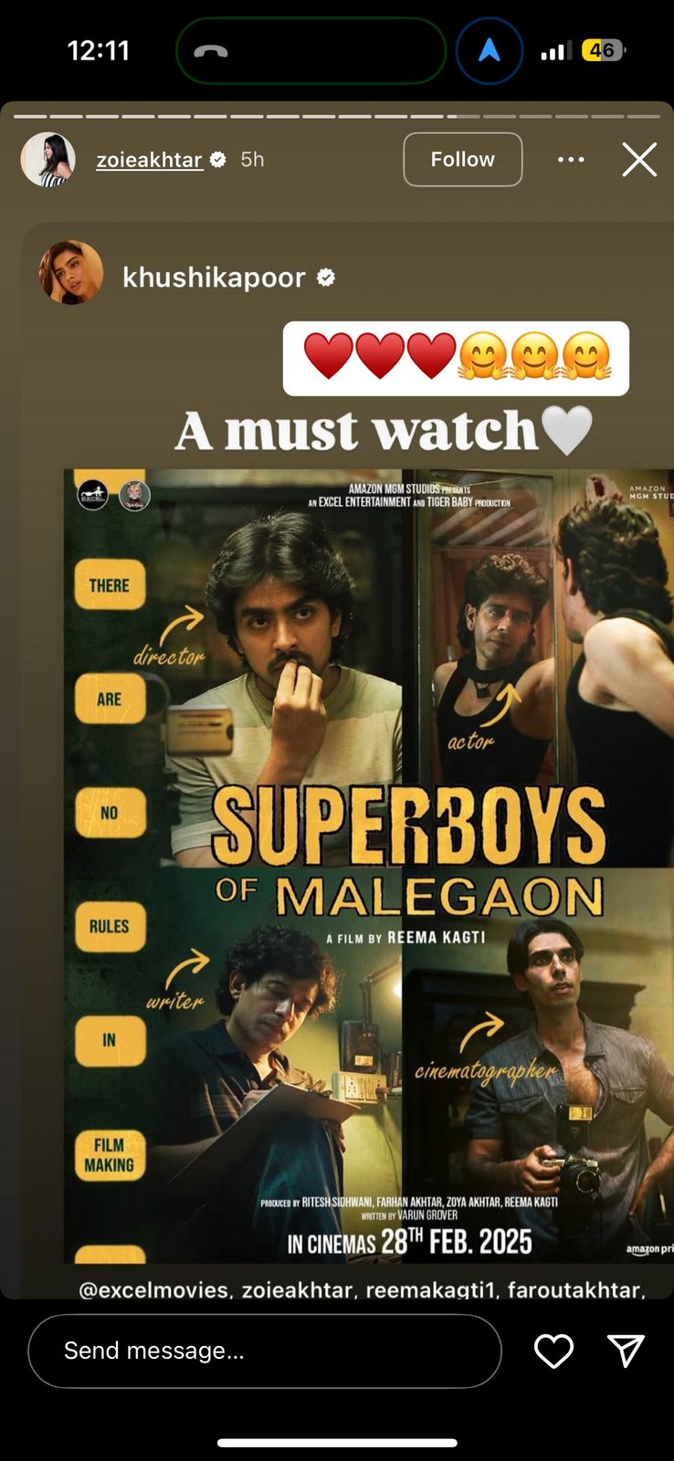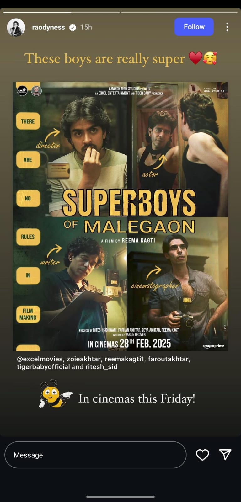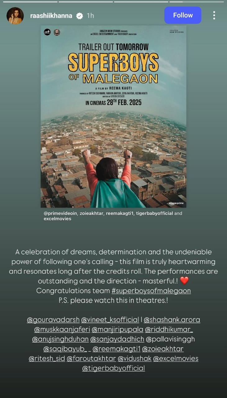 Raashii Khanna praised the film writing, “A celebration of dreams, determination and the undeniable power of following one's calling - this film is truly heartwarming and resonates long after the credits roll. The performances are outstanding and the direction - masterful.! C Congratulations team #superboysofmalegaon. P.S. please watch this in theatres.!”