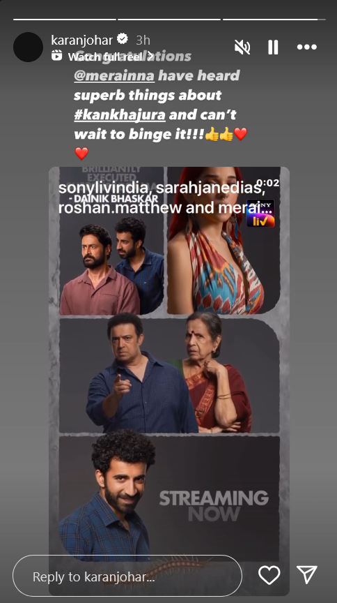 MUMBAI: Bollywood's most sought after film-maker Karan Johar, took to Instagram putting a story to congratulate actor Mohit Raina (@merainna) on his recent series on Sony LIV, KanKhajura. Appreciated for his part n this psychological thriller he wrote, “Congratulations @merainna have heard superb things about #KanKhajura and can’t wait to binge it!!!”