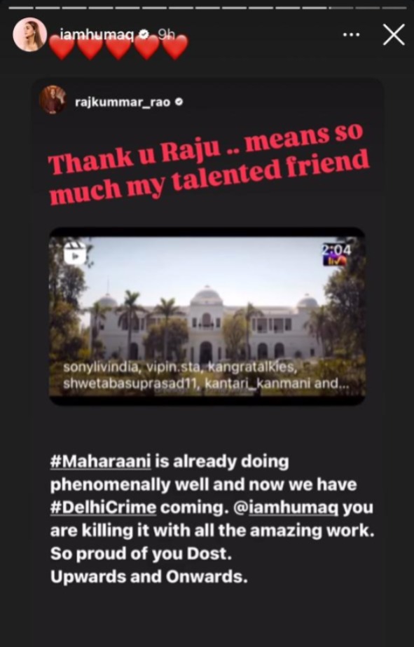 Joining the chorus of admiration is Rajkummar Rao, who took to social media to applaud his dost Sharing his excitement for her ongoing streak, he wrote, “#Maharani is already doing phenomenally well and now we have #DelhiCrime coming. @iamhumaq you are killing it with all the amazing work. So proud of you dost. Upwards and onwards.”