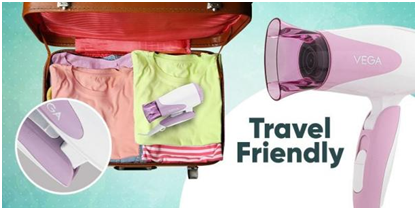 First and foremost, ensure the hair dryer has a foldable handle, making it easy to pack in luggage and suitable for everyday use. This design minimizes space while ensuring ultimate performance. We recommend buying the Vega Blooming Air 1000-1200 Watts Hair Dryer for quick drying and easy styling. Apart from its convenient foldable handle, this compact hair dryer boasts the following features as well: