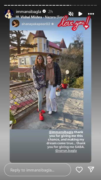 Sharing a photo clicked against a bright sunny day, Shanaya Kapoor wrote, "@immansibagla thank you for giving me this chance, and making my dream come true...thank you for giving me SABA. @varun.bagla." Reacting to this warm gesture, Mansi Bagla reshared the expression on her Instagram story, and attached it with a "love you" avatar!