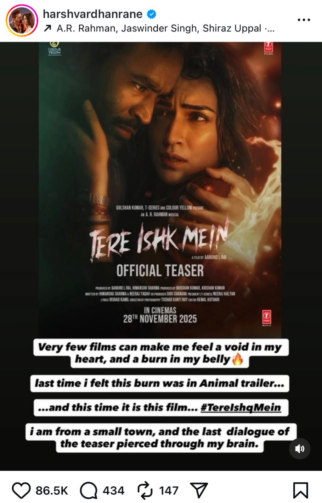 Her enthusiastic endorsement added to the growing excitement. Similarly, Actor Harshvardhan Rane also joined in appreciating the teaser with his post on Instagram where he wrote, “Last time I felt this burn was in Animal trailer..” followed by, “I am from a small town, and the last dialogue of the teaser pierced my brain.”