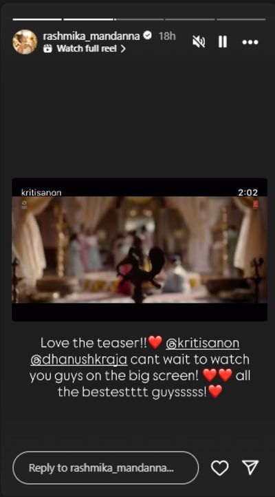 Instantly grabbing attention across social media platforms. South superstar Rashmika Mandanna was all praise as she wrote on her Instagram, “Loved the teaser!! @kritisanon @dhanushkraja can’t wait to watch you guys on the big screen! All the bessstt guysss!!”