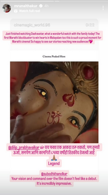 “Just finished watching Dashavatar, what a wonderful watch with the family today! The first Marathi blockbuster to win hearts in Malayalam too this is such a proud moment for Marathi cinema! So happy to see our stories reaching new audiences. @dilip_prabhavalkarsir वय फक्त एक आकडा ठरू शकतो, पण तुमची ऊर्जा, समर्पण आणि कामगिरी ८१व्या वर्षीही तितकीच तेजस्वी आहे Legend @subodhkhanolkar Your vision and command over the film doesn’t feel like a debut. It’s incredibly impressive,” she wrote on her social media stories.