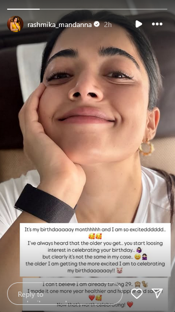 Sharing an adorable picture of her, Rashmika wrote, “It's my birthdaaaaay monthhhhh and I am so excitedddddd..I've always heard that the older you get.. you start loosing interest in celebrating your birthday.. but clearly it's not the same in my case.. the older I am getting the more excited I am to celebrating my birthdaaaaaay!! I can't believe I am already turning 29.. I made it one more year healthier and happier and safely! Now that's worth celebrating!”