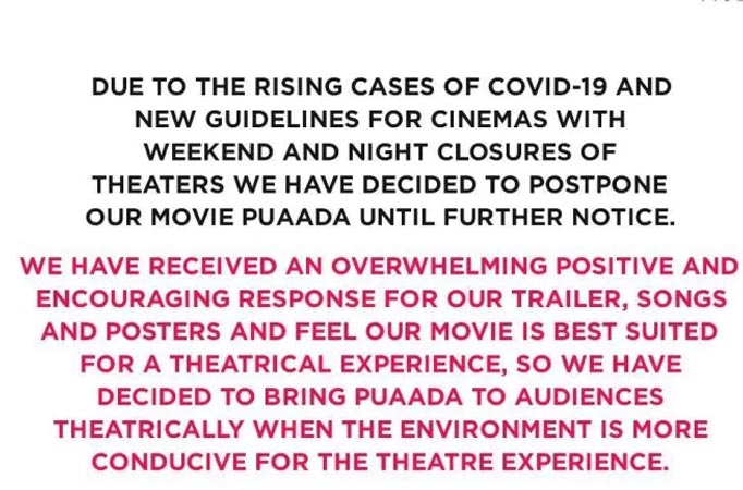 The statement says: "Due to the rising cases of Covid-19 and new guidelines for cinemas with weekend and night closures of theatres, we have decided to postpone our movie Puaada until further notice."