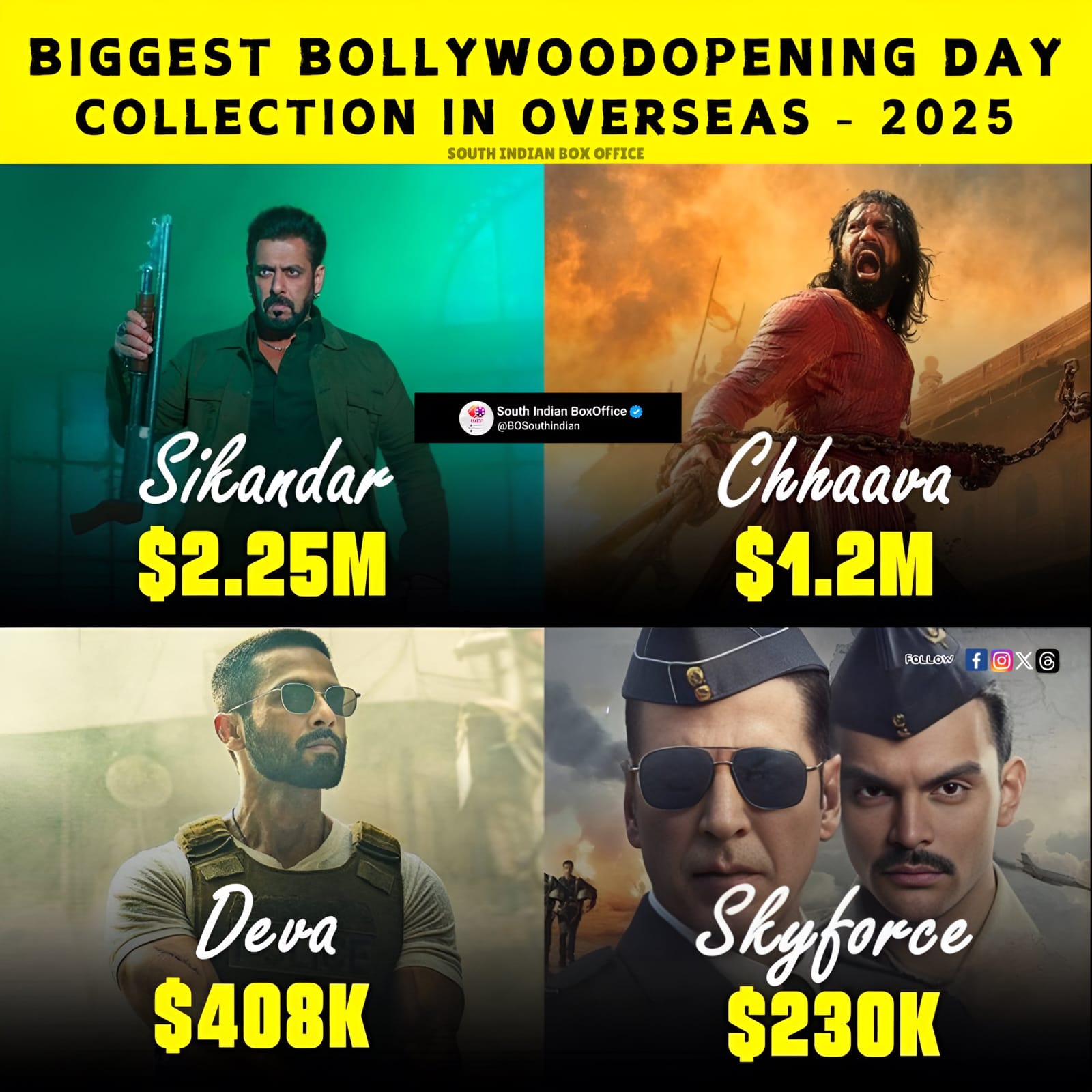 The film’s massive success overseas has sent waves of excitement through both audiences and the film industry. Following closely behind is Chhaava, which grossed $1.2 million on its opening day, proving that there’s a strong appetite for Indian films internationally. Meanwhile, Deva managed to secure $408K, and Skyforce earned $220K, marking significant milestones for each.