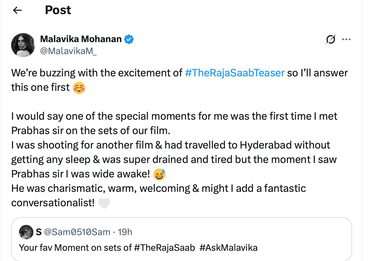 She posted, “We’re buzzing with the excitement of #TheRajaSaabTeaser so I’ll answer this one first