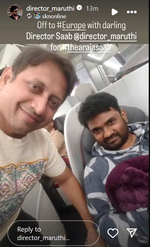 The film’s creative producer SKN took to social media to share an update with fans, posting a picture alongside director Maruthi and writing, “Off to #Europe with darling Director saab @director_maruthi for #therajasaab.”