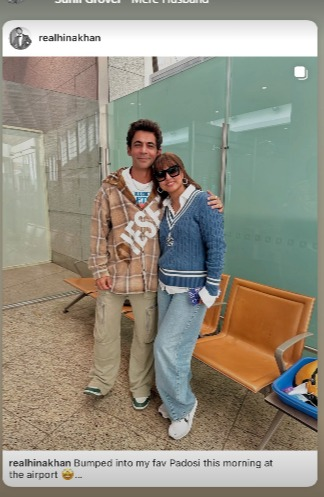 Hina recently shared a picture where she bumped into her neighbor. We are talking about none other than comedian and actor sunil Grover. She captioned it, “Bumped into my fav padosi this morning at the airport.”