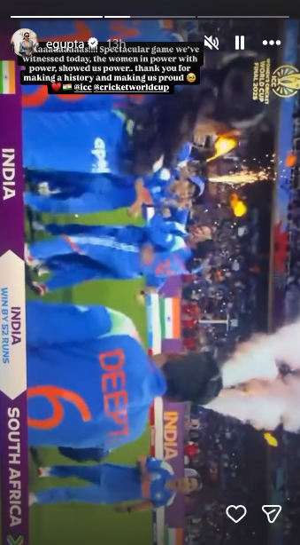 “Indiaaaaaaaas!!!! Spectacular game we’ve witnessed today, the women in power with power, showed us power.. thank you for making a history and making us proud”