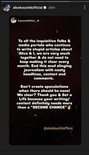 Taking to social media, Kanwar wrote, "To all the inquisitive folks and media portals who continue to write stupid articles about Alice and I, we are vert much together & do not need to keep making it clear every month. End this mud slinging journalism with nasty headlines, content and comments."