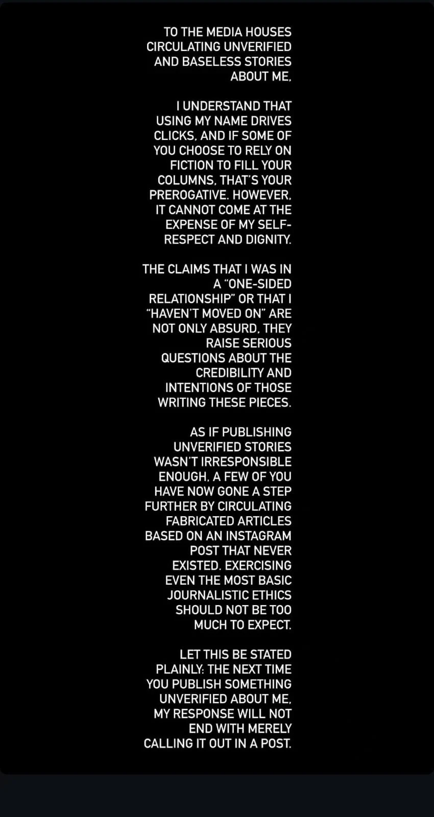 "To the media houses circulating unverified and baseless stories about me. I understand that using my name drives clicks, and if some of you choose to rely on fiction to fill your columns, that's your prerogative.