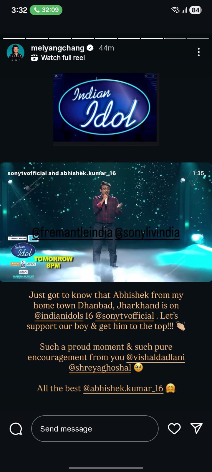 Over Instagram, Meiyang shared: “Just got to know that Abhishek from my home town Dhanbad, Jharkhand is on Indian Idol. Let's support our boy & get him to the top!!! Such a proud moment & such pure encouragement from you Vishal Dadlani and Shreya Goshal. All the best Abhishek”