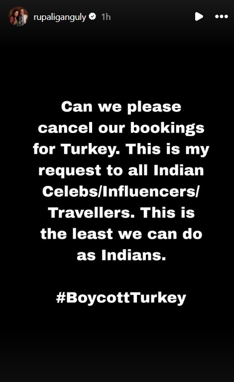 As international support for India pours in from various nations condemning terrorism, a few countries like Turkey have taken a controversial stance by siding with Pakistan. In response, Rupali once again used her platform to raise her voice. With over a million followers backing her, she shared a powerful Instagram story urging Indians to stop visiting Turkey.
