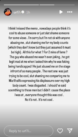 Taking to her Instagram account, Uorfi wrote, “I think I missed the Memo, nowadays people think it's cool to abuse someone or to slut shame someone for some views. I’m sorry but i’m not ok with anyone abusing me, slut shaming me for my body count (which they don’t know but they just assumed it must be high) All this for what? For 2 mins of fame? This guy who abused me wasn’t even joking,.... “