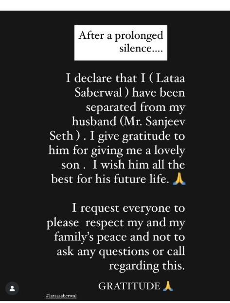 Lata went on to extend her heartfelt gratitude to Sanjeev for the beautiful journey they shared and, most importantly, for their beloved son. With grace and dignity, she wished him nothing but happiness and success in the path that lies ahead.