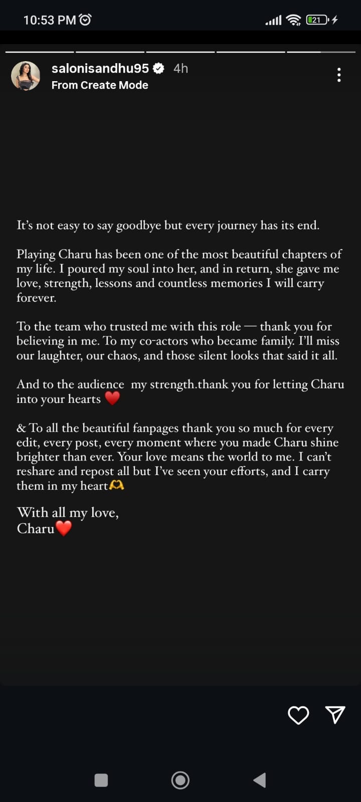 She wrote, "It's not easy to say goodbye but every journey has its end. Playing Charu has been one of the most beautiful chapters of my life. I poured my soul into her, and in return, she gave me love, strength, lesson and countless memories I will carry forever."
